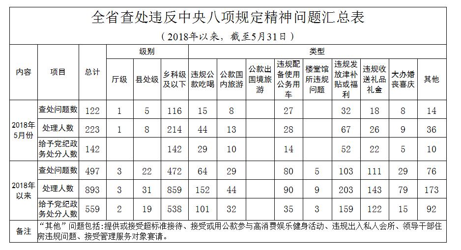 2018年5月,浙江全省各级纪检监察机关共查处违反中央八项规定精神问题122起,处理223人,给予党纪政务处分142人,其中,违规发放津补贴或福利问题32起,违规配备使用公务用车问题27起,违规收送礼品礼金问题18起,违规公款吃喝问题15起,这4类问题占查处问题总数的75.4%。